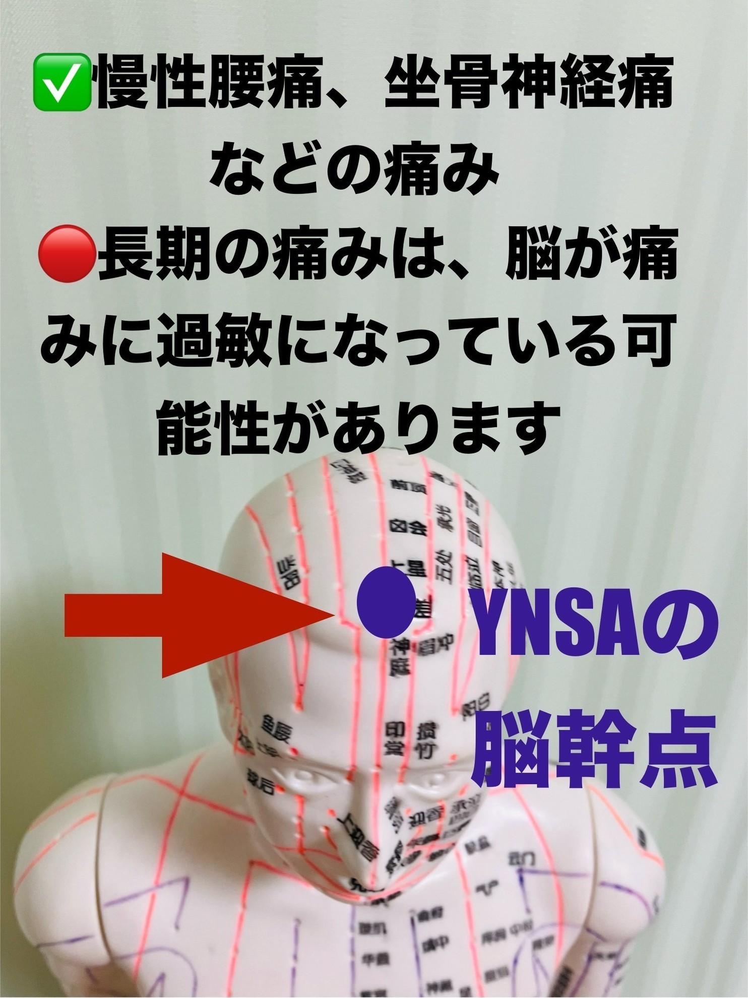 YNSA(山元式新頭鍼療法)では、腰痛・肩痛・首痛・関節痛などの慢性的な痛みだけでなくギックリ腰などの急性の痛みにも対応しています。