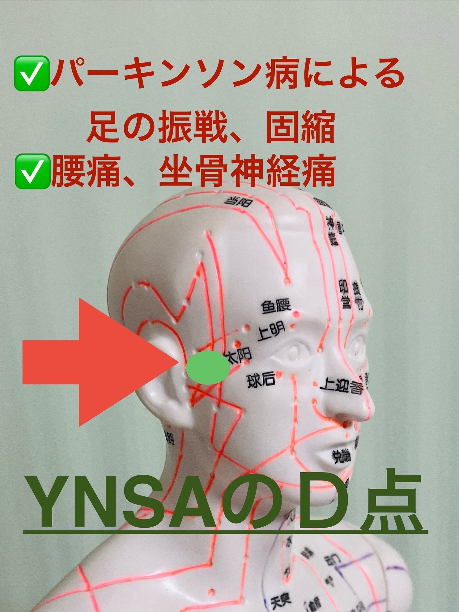YNSA(山元式新頭鍼療法)の施術では、パーキンソン病の足の振戦・固縮(筋緊張)足のすくみ、突進歩行などに対してⅮ点を使うことが多いです。