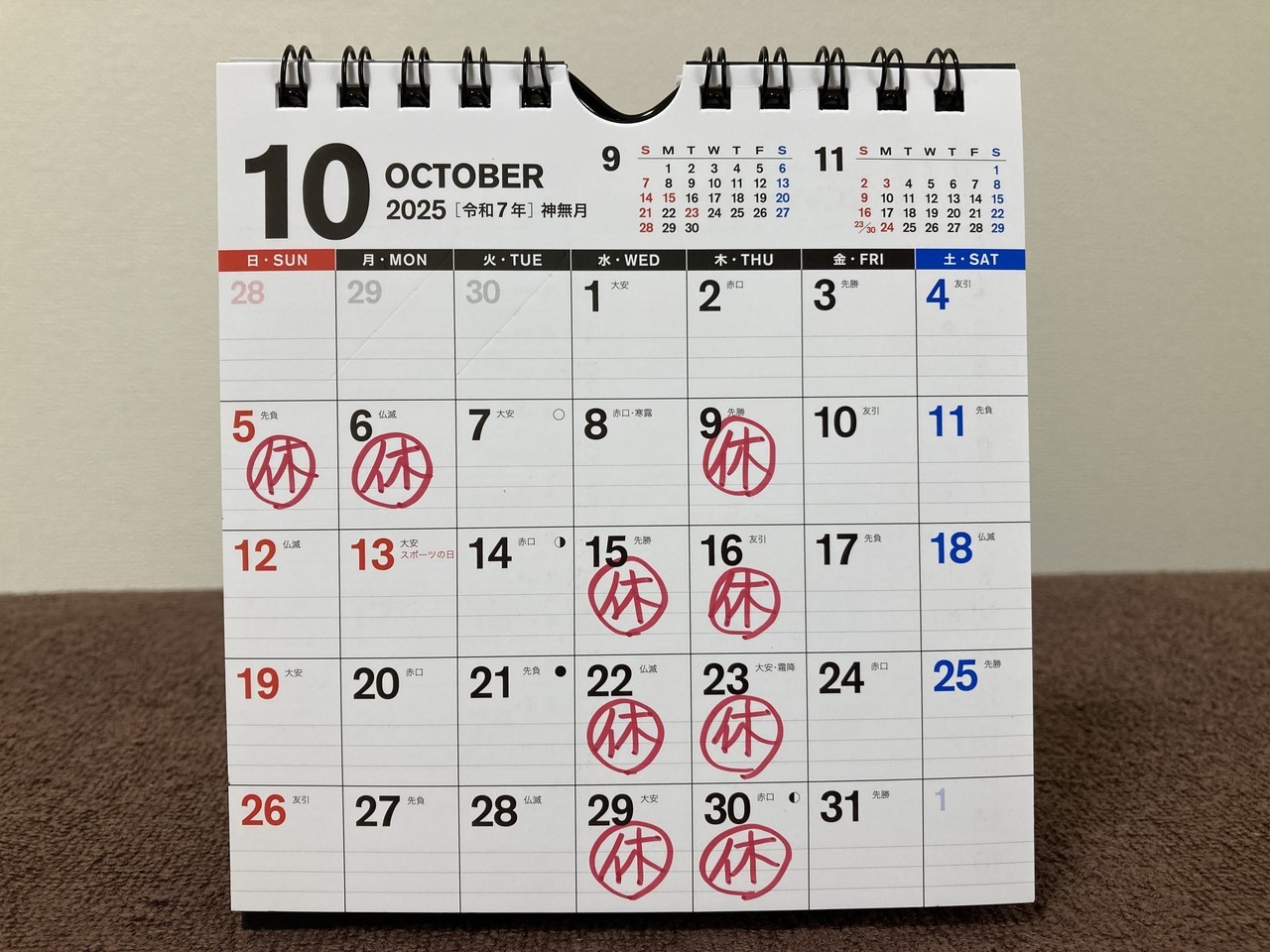 ✅10月の休診日は5日(日)、6日(月)、9日(木)